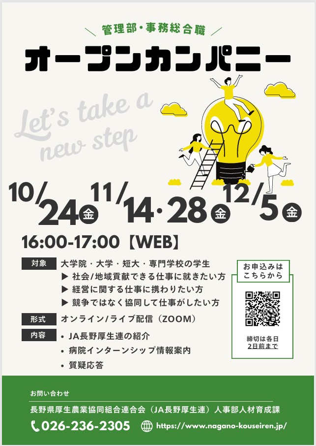 JA長野厚生連をもっと知っていただくために、オンラインでのオープンカンパニーを開催いたします。ご予約はマイナビからエントリー後、当会マイページにて申込可能です。皆さまのご参加を心よりお待ちしております!