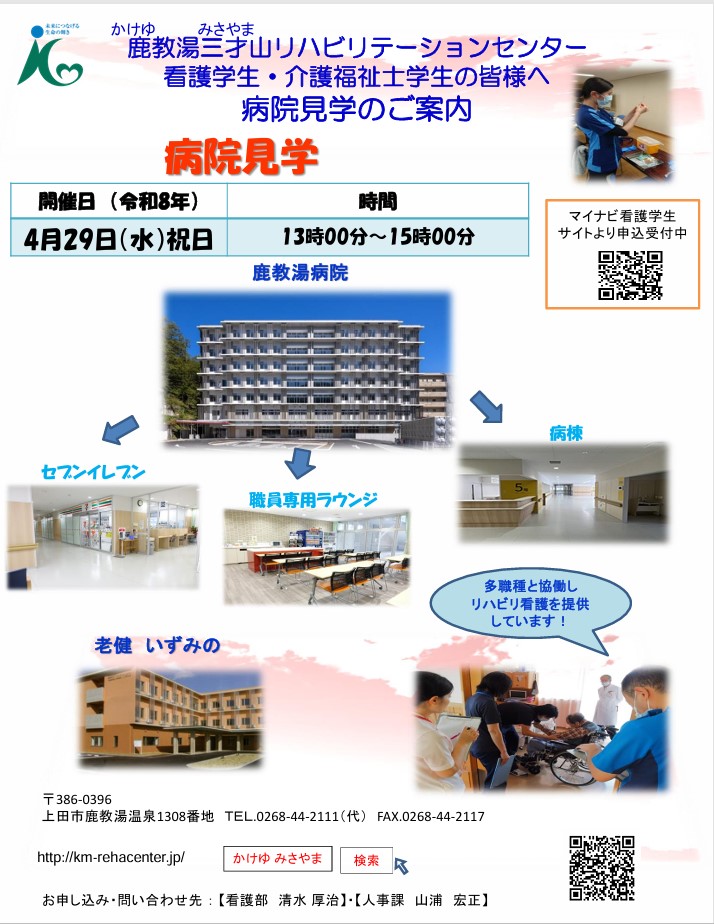 2026年04月03日 医療関係者の方へ 採用情報 [看護職・介護職向け]病院見学会(インターンシップ)のご案内 当センターでは病院見学会を実施しております。就職を考えている方、ご興味のある方、お気軽にお申込みください!! 詳細は下記よりご参照ください。 一覧へ戻る 次の記事