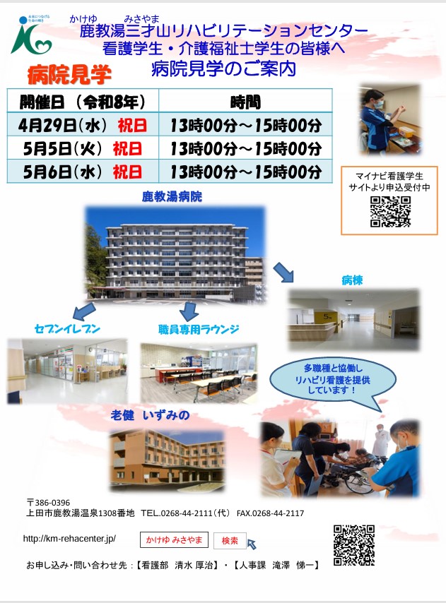 2026年04月23日 医療関係者の方へ 採用情報 [看護職・介護職向け]病院見学会(インターンシップ)のご案内 当センターでは病院見学会を実施しております。就職を考えている方、ご興味のある方、お気軽にお申込みください!! 詳細は下記よりご参照ください。 一覧へ戻る 次の記事